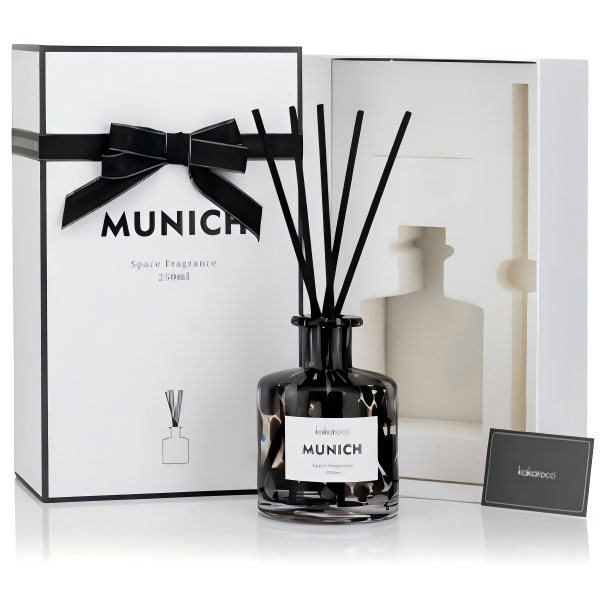 • Munich: Obsidian bottle, same refined silhouette — identical luminous blend, reimagined as midnight in Cairo: deep, mysterious, infinitely layered. Perfect for lounges, suites, or moments of quiet indulgence.
