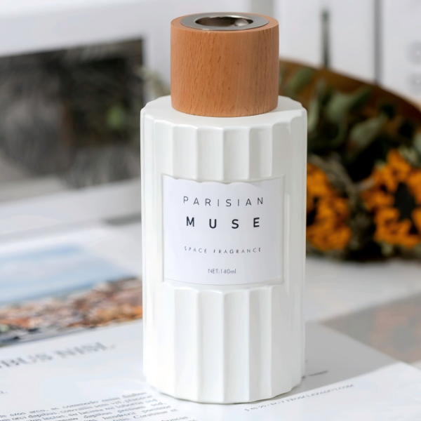 • Parisian Muse: White ribbed ceramic, natural wood cap, minimalist label — designed for desks, dressers, and dreamers. Like sunlight through sheer curtains in a Left Bank apartment — clean, cultured, quietly powerful.